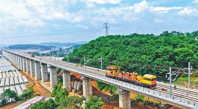 4月28日拍摄的渝昆高铁云南段首条接触网导线架设作业现场。当日,该架设任务顺利完成,标志着渝昆高铁云南段正式进入全线接触网导线架设阶段。杨紫轩摄(新华社发)