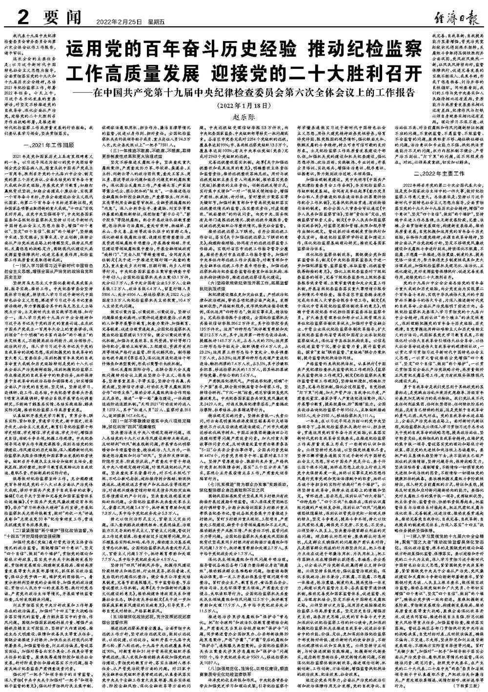 运用党的百年奋斗历史经验 推动纪检监察 工作高质量发展 迎接党的二十大胜利召开——在中国共产党第十九届中央纪律检查委员会第六次全体会议上的工作报告