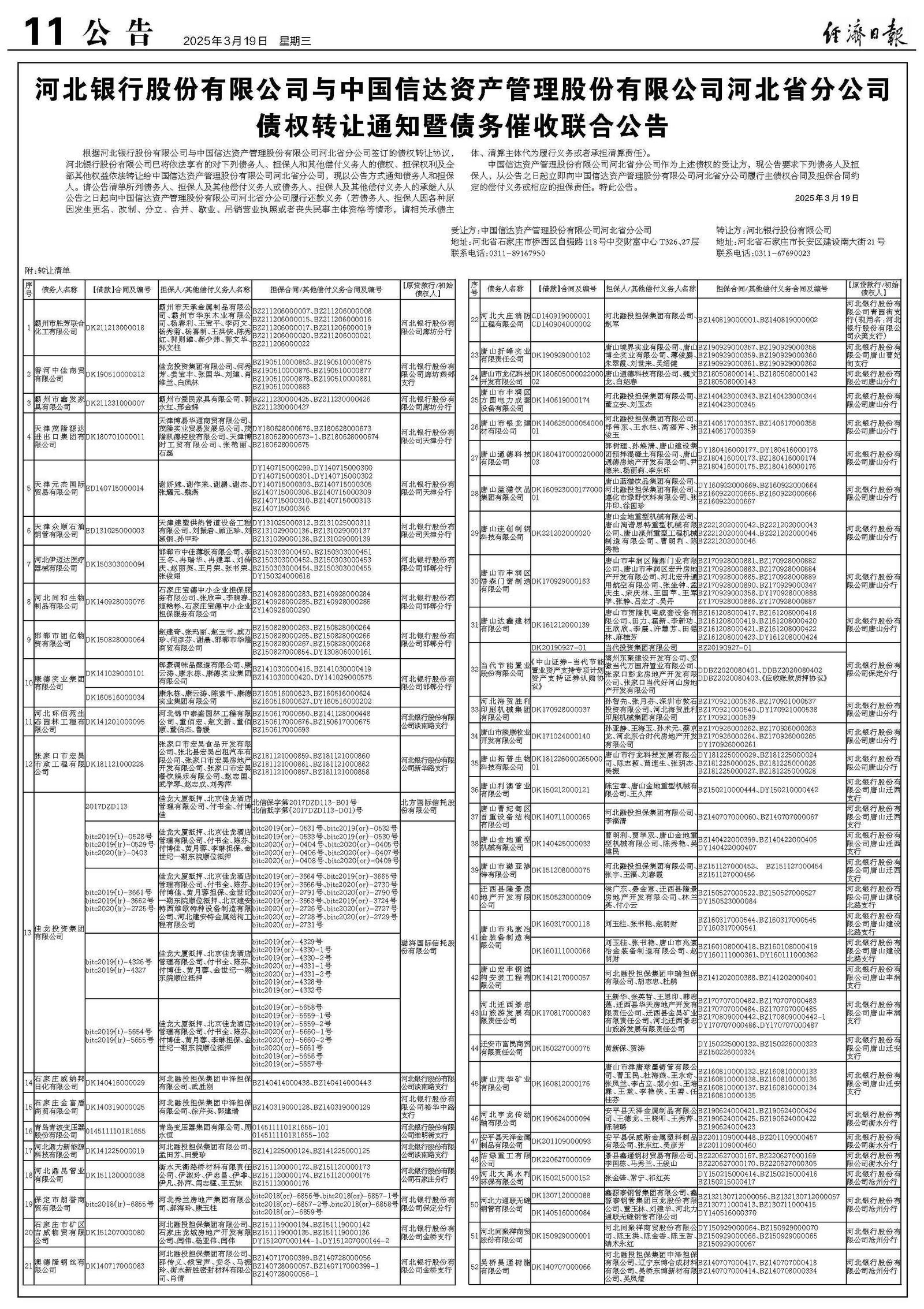 河北银行股份有限公司与中国信达资产管理股份有限公司河北省分公司债权转让通知暨债务催收联合公告